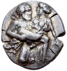 Vorderseite: Vollbärtiger Silen kniet in Dreiviertelansicht nach r. In den Armen hält er eine Mänade im langen Gewand (chiton). Sie streckt die r. Hand und senkt den l. Arm.