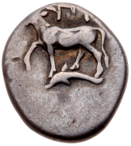Vorderseite: BY. Rind auf einem nach l. gewendeten Delphin nach l. stehend, den r. Vorderfuß erhoben.