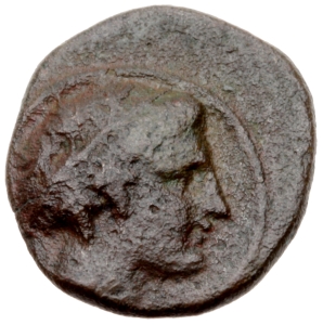 Vorderseite: Kopf des jugendlichen Dionysos oder einer Mänade mit langen Haaren und Efeukranz nach r.