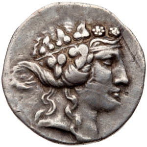 Vorderseite: Kopf des Dionysos mit Efeukranz nach r.