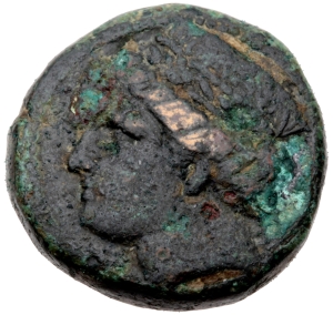 Vorderseite: Weiblicher Kopf (Demeter?) mit Ohrring, Halskette und breiter Stephane, darauf ein Lorbeerkranz, nach l.