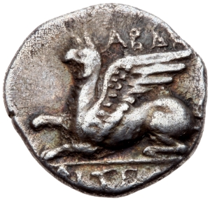 Vorderseite: ΑΒΔH/PITEΩΝ. Greif liegt mit geschlossenen Flügeln nach l. Ethnikon oben und unten.