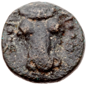 Vorderseite: Stierkopf mit Bändern (taeniae) von vorn.