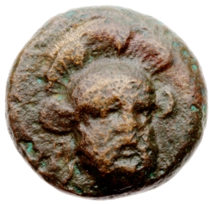 Vorderseite: Bärtiger Kopf mit Helm und dreifachem Helmbusch in der Dreiviertelansicht nach r.